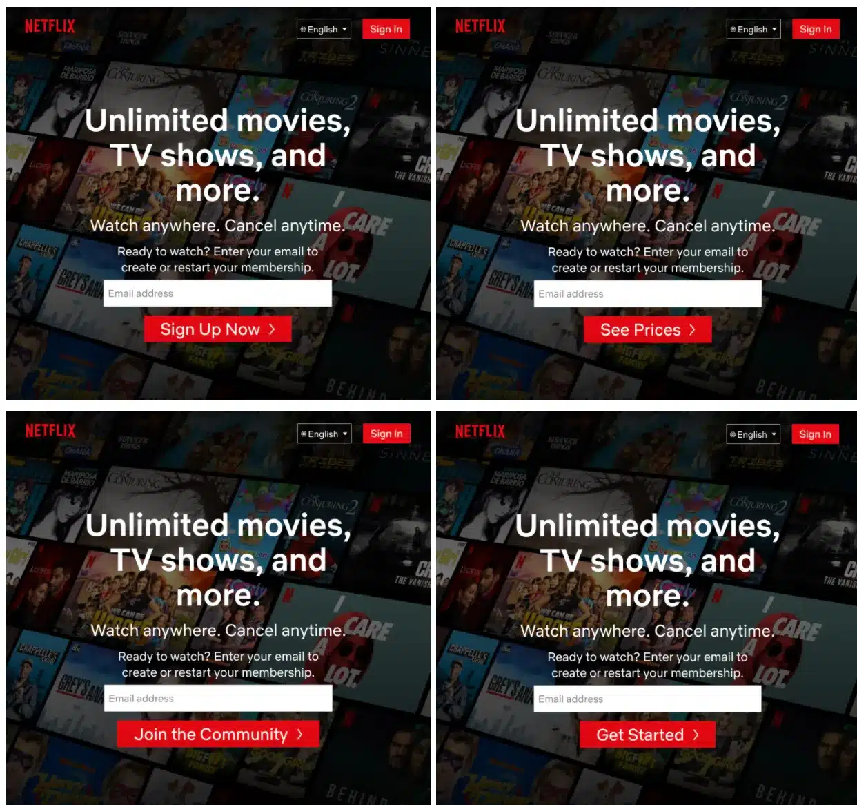 Netflix: Netflix uses A/B testing to test and refine its user interface. For example, from the Netflix Tech Blog, in 2019 the company tested a new feature that allowed users to shuffle episodes of a TV show or watch them in order. In 2021 it tested various button texts to subscribe. Netflix uses A/B testing to improve its content recommendation algorithm. For example, in 2018 the company tested a new feature that allowed users to hide titles they didn’t want to see in their recommendations.