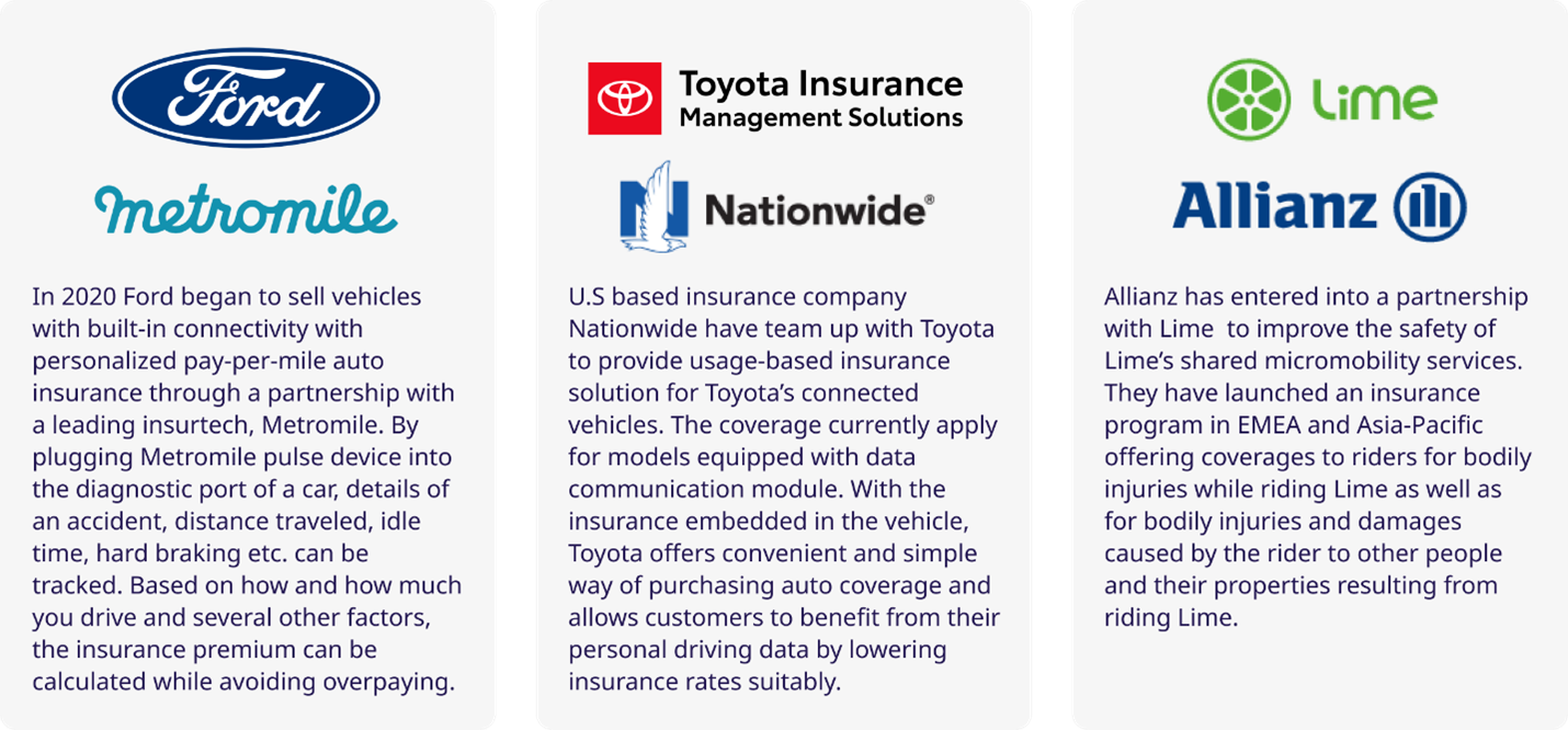 With the impact of all these developments, automotive manufacturers like Tesla, BMW, Toyota, Daimler, Volvo, Ford have begun to experiment with embedded insurance and UBI model. Through telematics technology, the real-time data about the distance traveled, the speed of the vehicle, how hard the brake is pressed or how fast it is accelerated can be obtained easily and policies can be priced more accurately and flexibly.