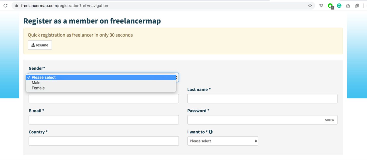 The examples that are shown below meant to provide practical insight about filling forms and give an idea how experience can be developed more inclusively. One of the most common experience is filling forms. This can be triggering experience, especially if they are still in the process of figuring out their gender identity. First platform requires people to pick gender if they want to create and account with just giving two options and doesn’t explaining why they would need this information.