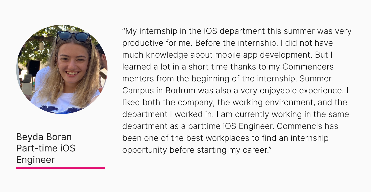 Our interns who attended the Commencis Summer Campus had the opportunity to recognize Commencis company culture, meet with their colleagues face-to-face and work on their intern projects together. They completed the internship program with delightful memories and long-lasting friendships. They also obtained experience by working with Commencers who are among the best in their fields. You can also check out Onur’s article from our intern team about his internship experience at Commencis.