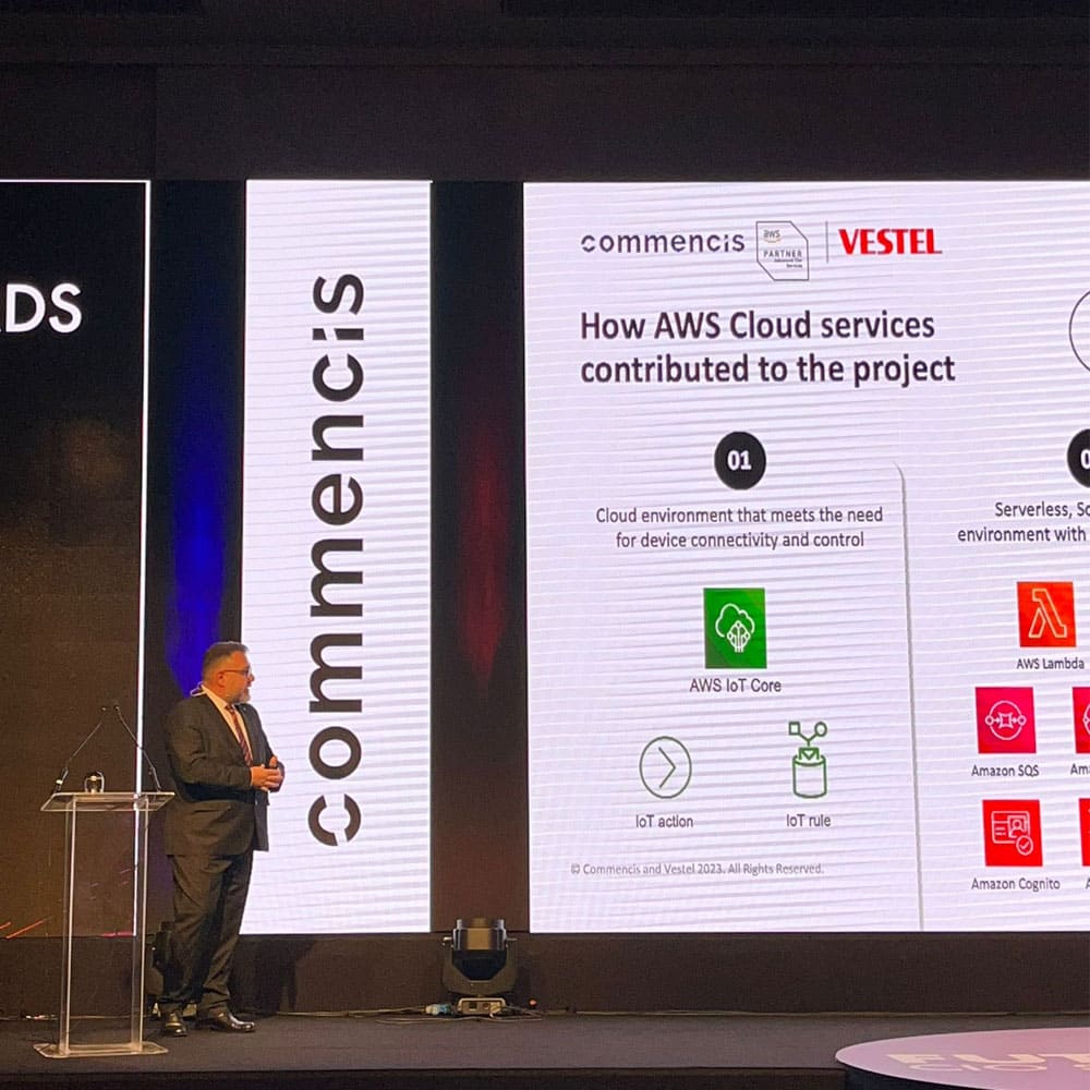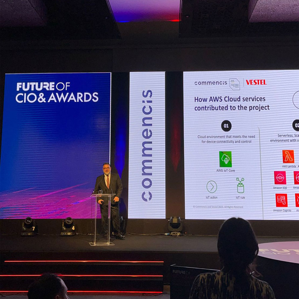 On April 27th, a gathering of technology leaders and innovators took place at the Future of CIO Summit event, specifically planned to explore and exchange ideas in the field of information technology and cloud. The event featured many discussions and presentations on how cloud technologies can shape the IoT ecosystem. Sait Alp Pekin, Commencis Cloud Chief Commercial Officer, and Anıl Gürbüz, Vestel’s Cloud Systems Group Manager, stepped onto the stage to enlighten the audience about potentials of AWS on IoT in an agile and competitive business environment. In the event, Anıl Gürbüz received the ‘Leaders of Tomorrow’ award for the Veezy app. The VeeZy app, designed by the Vestel UX/UI Design Group for Vestel, is a cutting-edge application developed for smart homeowners. It provides seamless control and monitoring of home appliances, empowering users to effortlessly manage their smart homes with convenience and efficiency. In addition, we would also like to congratulate Anıl Gürbüz for his well-deserved recognition with the ‘Leaders of Tomorrow’ award, honoring his contributions to the Veezy app.