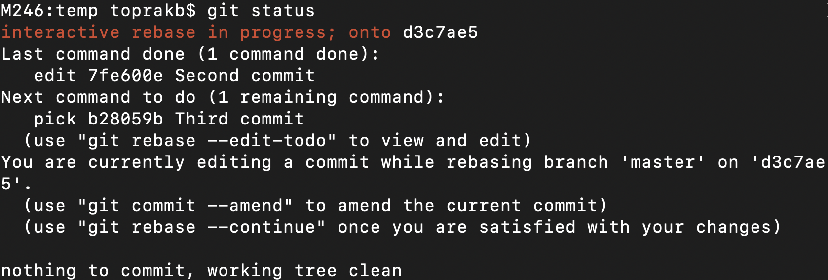 After making changes to this file and saving it, I start the rebase process. If I check the git status, I see the ongoing rebase process.