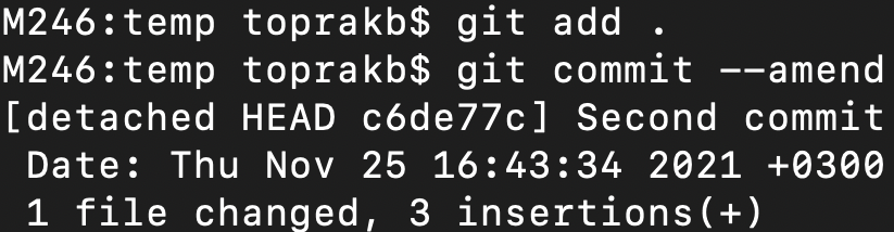 I made change in the relevant commit. This time I used “commit –amend” because I don’t want to create a new commit. Now is the time to rewind time.
