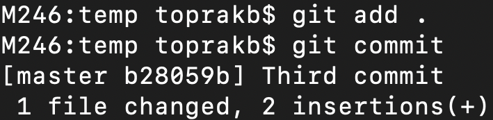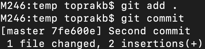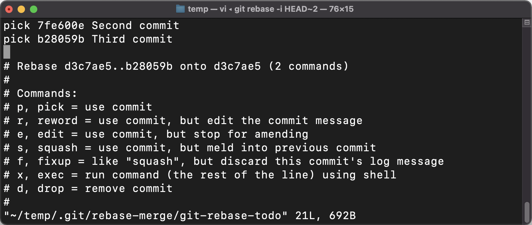 By editing this file as necessary, I declare which change I want to make in which commit. Since I want to make changes in the second commit, I save the file by replacing the “pick” text at the beginning of the second commit with “edit” (other options can be found below).
