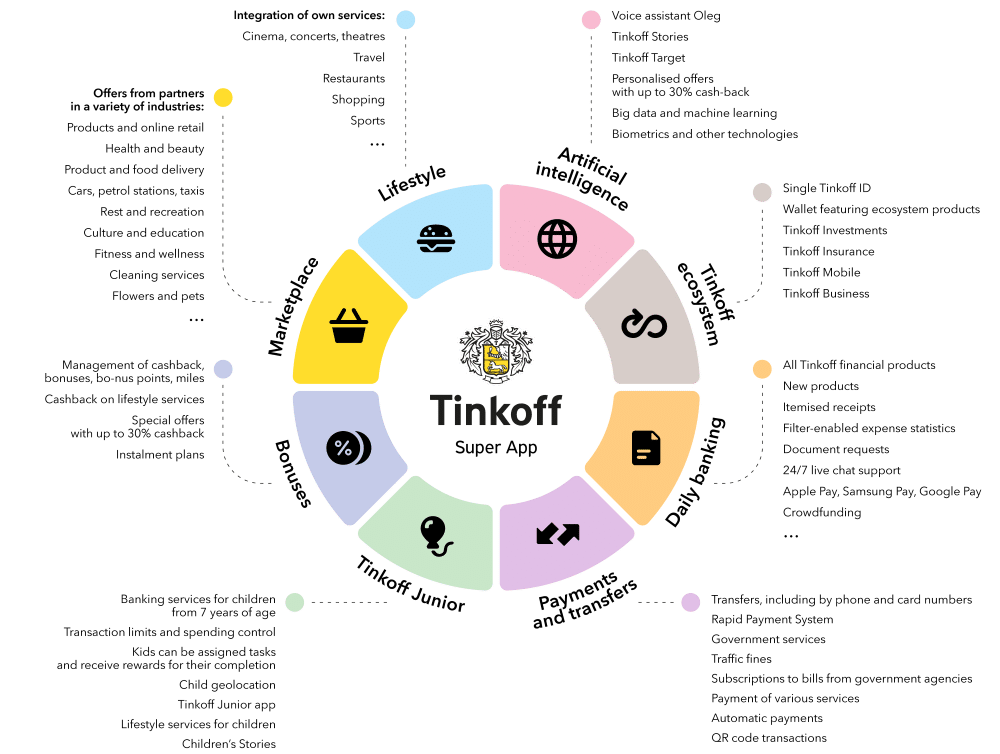 Tinkoff is the fastest growing financial app in all of Russia, with over 20 million users. It allows users to perform standard banking app activities like daily banking, payments and transfers. But it also offers bonuses like cash back, it offers Tinkoff Junior for kids, and showcases merchants’ offerings like health & beauty, food & delivery, ride-hailing, entertainment, culture & education, fitness, cleaning, and much more.